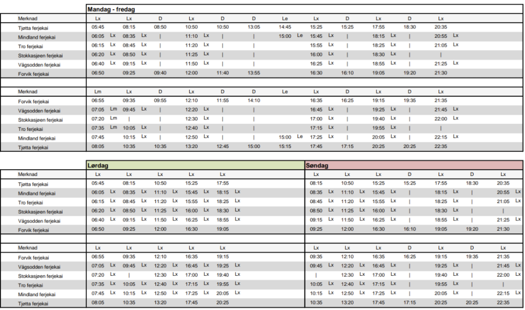 Fra Vågsodden 07:05, 09:45, 12:20, 16:45, 19:25, 21:45 07:05, 09:45, 12:20, 16:45, 19:25 09:45, 12:20, 16:45, 19:25, 21:45