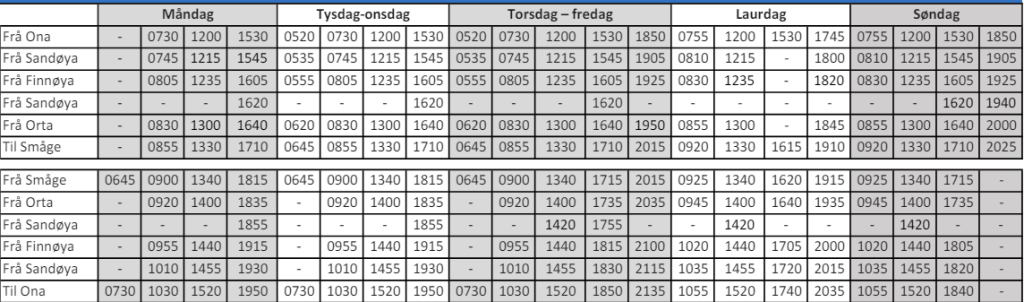 Hvis du vil reise mellom Ona – Sandøya – Finnøya – Orta – Småge, er det beste alternativet å bruke denne fergen, som du finner all informasjon om her. Fordelen er at du kan ta med ditt eget kjøretøy om bord. Denne ruten er noe annerledes enn de andre fergerutene, da det er en rute med flere stopp, og hvor du på noen rutetider går to ganger til Sandøya, på grunn av rutens struktur. Derfor har vi angitt det første stoppet som Sandøya, og det andre stoppet med en 2 for å markere når du kan gå fra det andre stoppet til Sandøya, og når du ikke kan det.